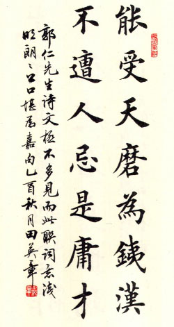 幼秉庭训,始攻欧书,聪颖好学,勤勉过人,青年时期便已负书名。后遍临历代名家,融会贯通,自成风格,长于楷法,兼精行草。曾赴日本、香港、台湾讲学办展,为日《每日新闻》称作“中国之一流书道家”。